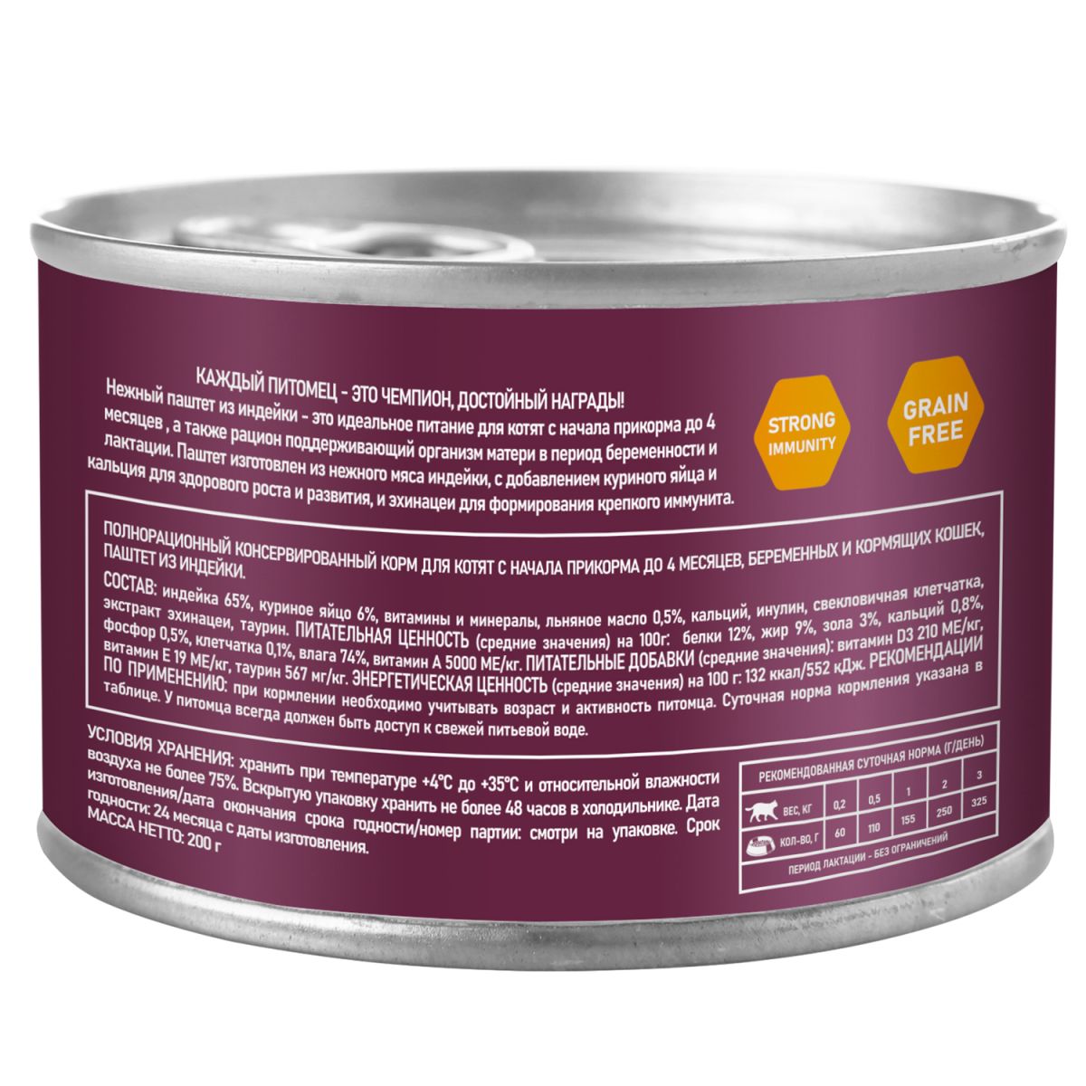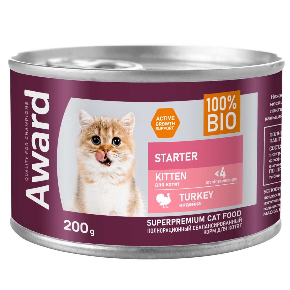 Влажный корм AWARD для котят с начала прикорма до 4 месяцев, беременных и кормящих кошек паштет из индейки 200г.
