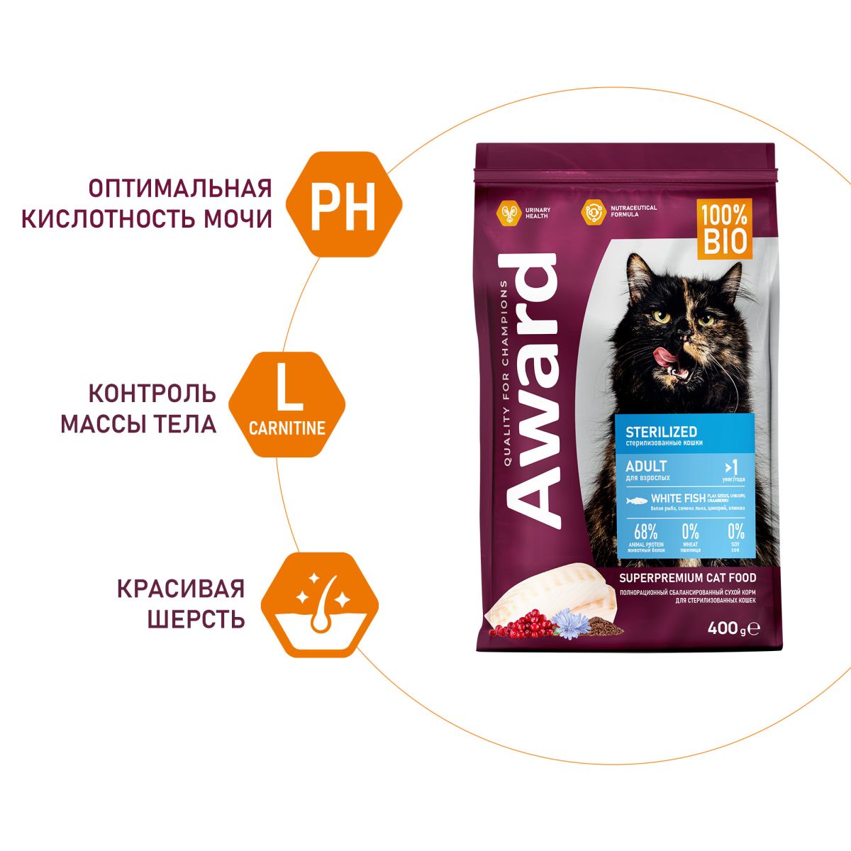 Читать все статьиAWARD корм Sterilized д/кош. с бел. рыбой 400г