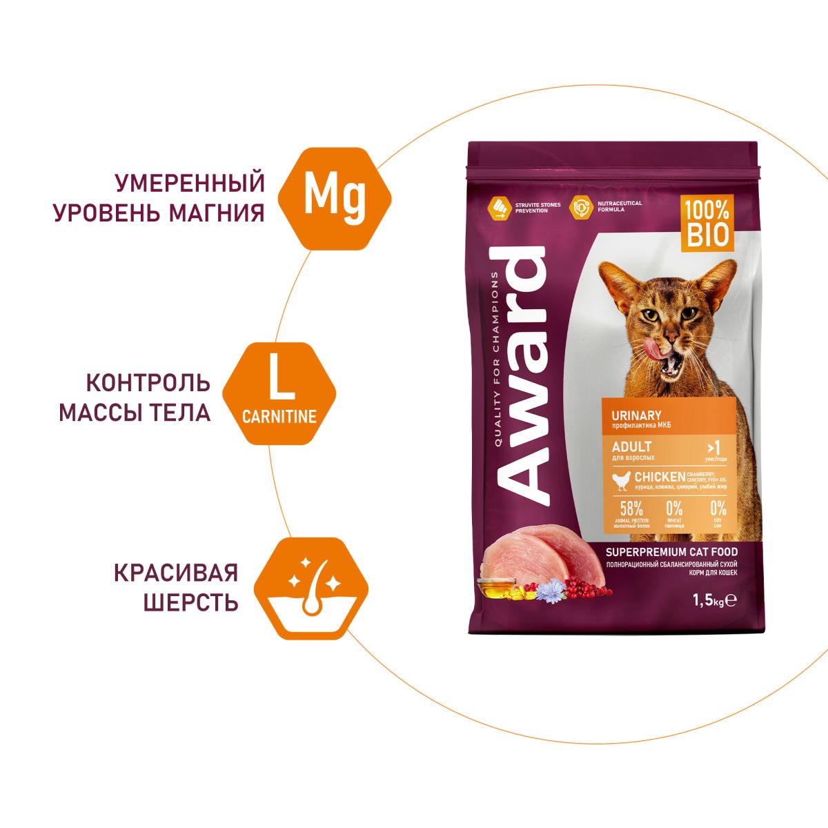 Сухой корм AWARD Urinary для взрослых кошек для профилактики мочекаменной болезни с курицей с добавлением клюквы, цикория и рыбьего жира 1,5 кг.