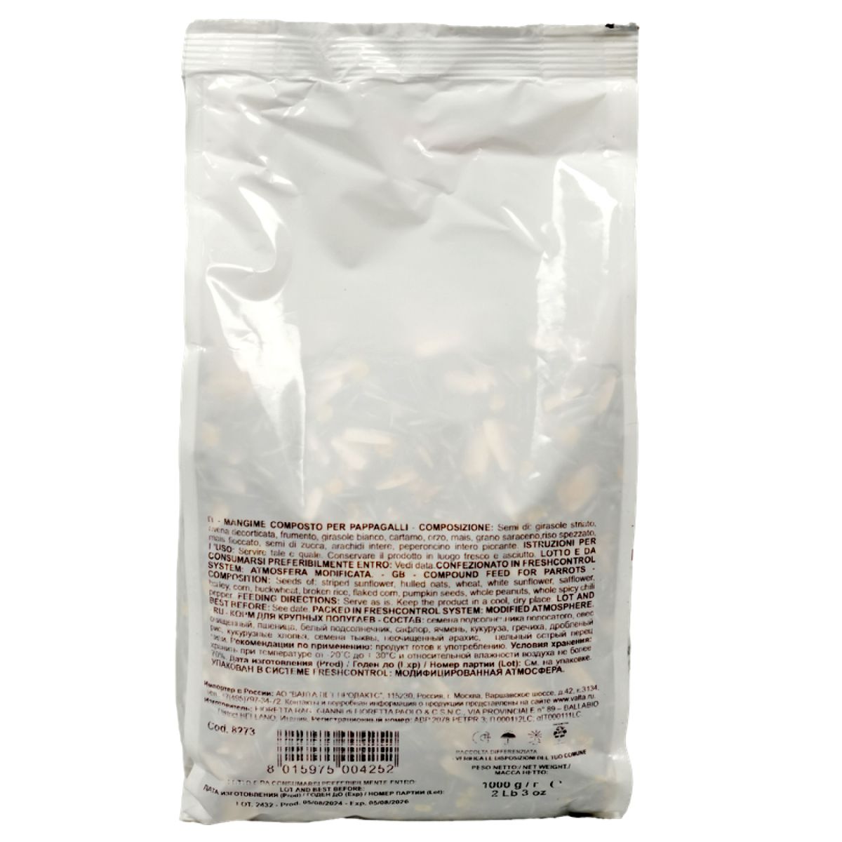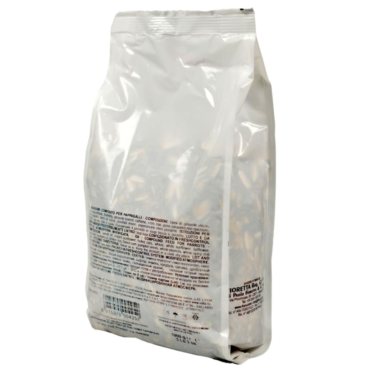 Корм содержит различные семена, которые составляют разнообразный и полезный рацион попугаев. В состав входят два вида подсолнечника, овёс, пшеница, кукуруза, сафлор, тыквенное семя, арахис.