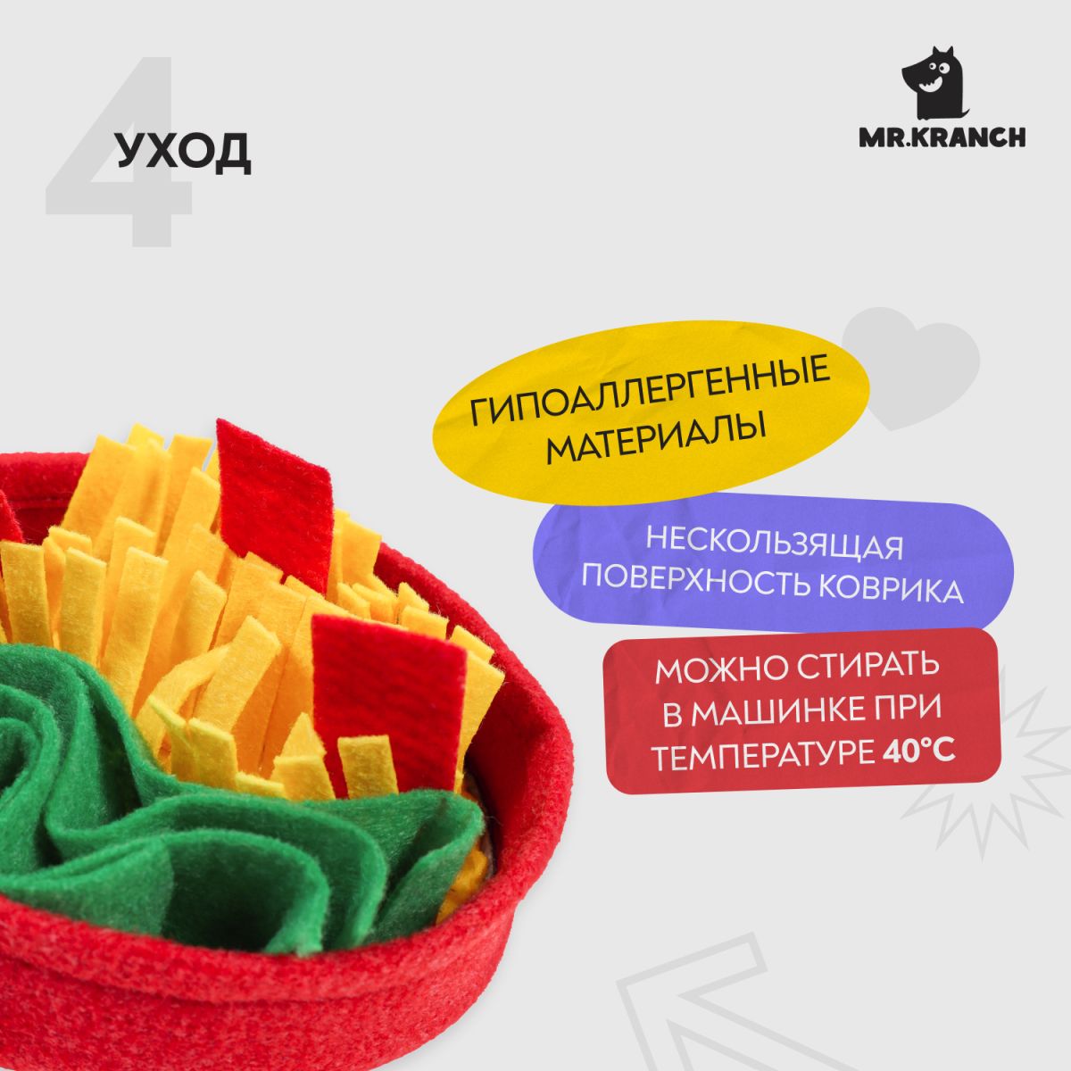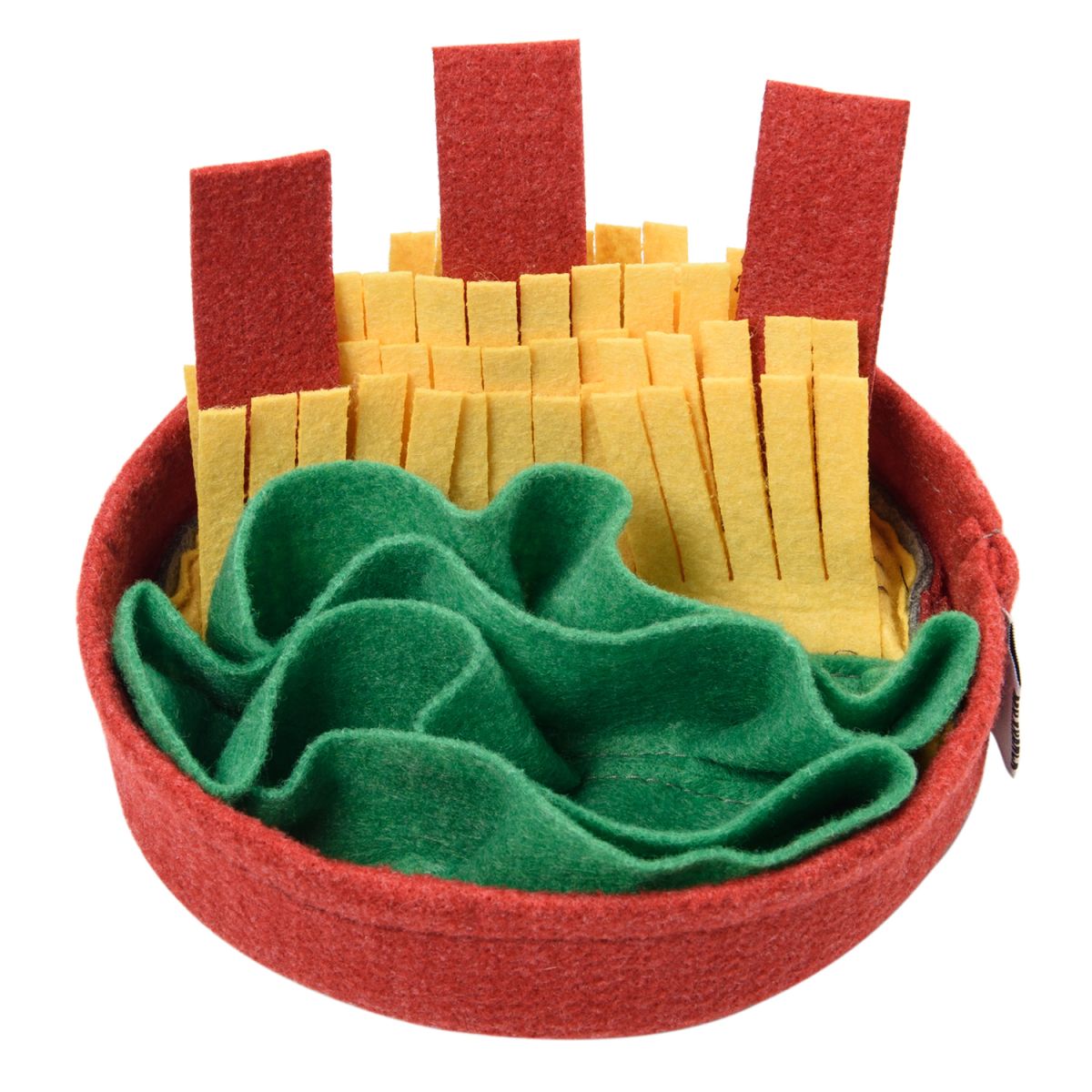 Многофункциональная нюхательная игрушка для собак «Пицца». Нюхательная игрушка - это уникальная развивающая игрушка, которая содержит комплекс упражнений различной сложности для развития интеллекта собаки. Выполняя упражнения, собака не просто вынюхивает любимый корм или лакомство, но и думает, как заполучить желаемую награду, что стимулирует развитие интеллектуальной деятельности. Способствует решению проблем с ЖКТ, а также выполняет функции анти-стресс игрушки. Произведено с использованием гипоаллергенных материалов. Уход: ручная стирка при температуре 40°С.