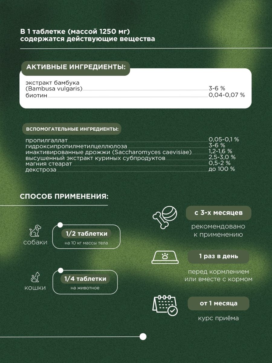 "Собакам раз в день из расчета ½ таблетки на 10 кг массы тела. Кошкам ¼ таблетки в день."В 1 таблетке (массой 1250 мг) содержится в качестве действующих веществ: экстракт бамбука (Bambusa vulgaris) – 3-6 %, биотин – 0,04-0,07 %, в качестве вспомогательных веществ: пропилгаллат – 0,05-0,1 %, гидроксипропилметилцеллюлоза – 3-6 %, инактивированные дрожжи (Saccharomyces caevisiae) – 1,2-1,6 %, высушенный экстракт куриных субпродуктов – 2,5-3,0 %, магния стеарат – 0,5-2 %, декстроза – до 100 %.доля флавоноидов (в пересчете на рутин) – 0,5-3,5 %. Содержание влаги не более 8 %.