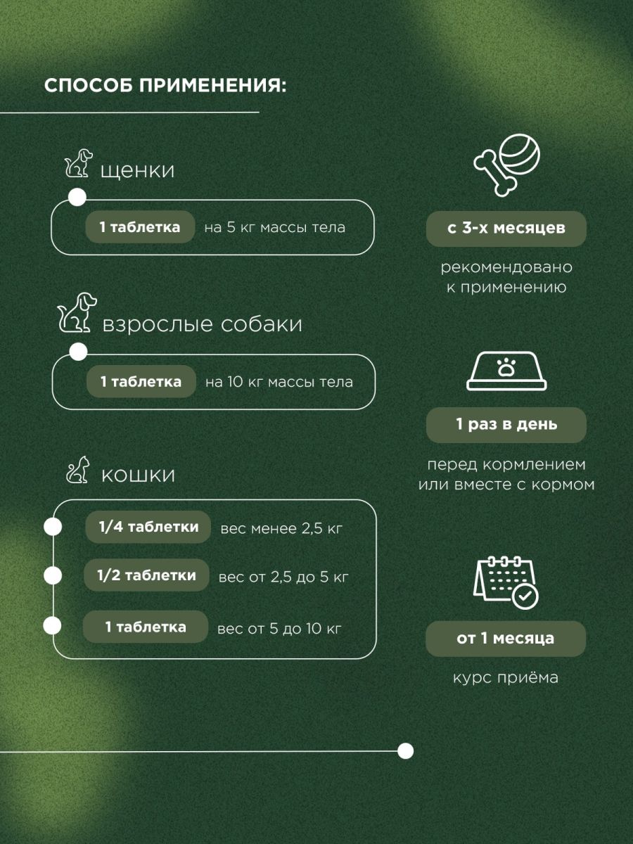 "Щенки: 1 таблетка на 5 кг массы тела в день; Собаки: 1 таблетка на 10 кг массы в день; Кошки: - при массе тела менее 2,5 кг – ¼ таблетки в день; - при массе тела от 2,5 до 5 кг – ½ таблетки в день; - при массе тела от 5 до 10 кг – 1 таблетка в день."Похожие товары