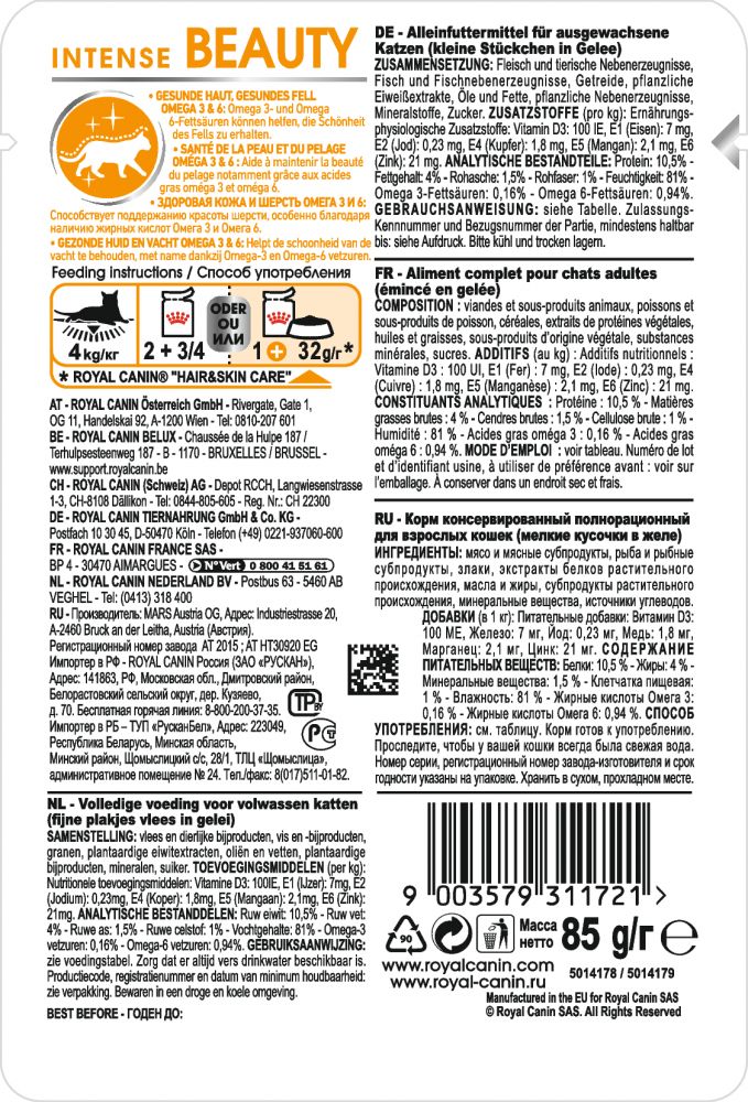 Интенс бьюти: влажный корм для взрослых кошек. Кожа - самый большой орган тела. Для регулярного обнолвения клеток кожи и поддержания ее функций необходимы особые питательные вещества. Продукт INTENSE BEAUTY в желе обеспечивет баланс питательных веществ, необходимый взрослым кошкам в возрасте от 1 до 7 лет для красоты шерсти и здоровья кожи .