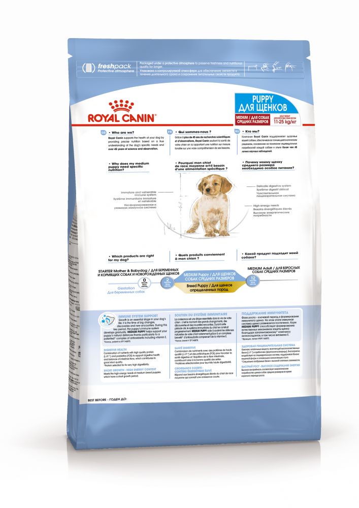 Продукт ROYAL CANIN® Medium Puppy разработан для щенков средних пород (вес взрослой собаки от 11 до 25 кг) в возрасте от 2 до 12 месяцев. Благодаря высокому содержанию белков ROYAL CANIN® Medium Puppy поддерживает гармоничное развитие щенка, рост его костей и мышц в течение относительно короткой фазы роста.