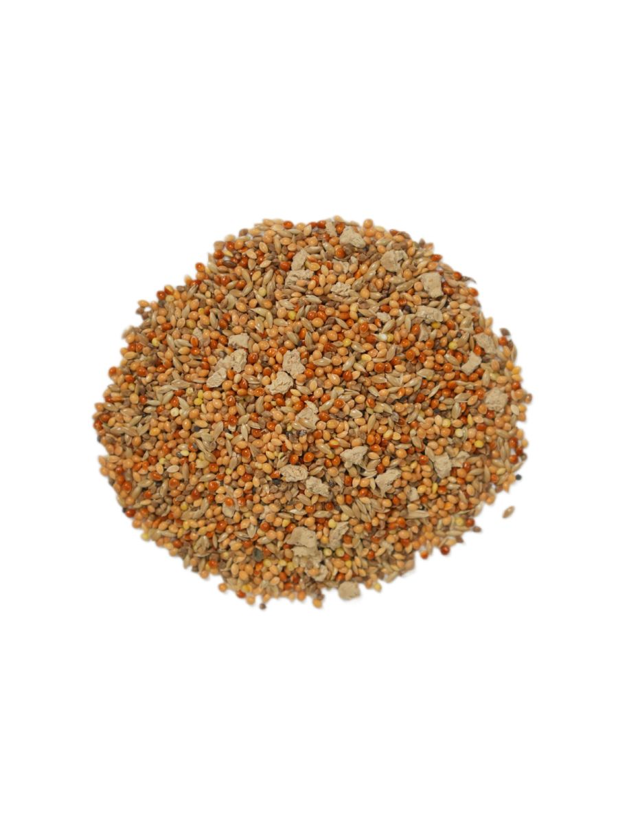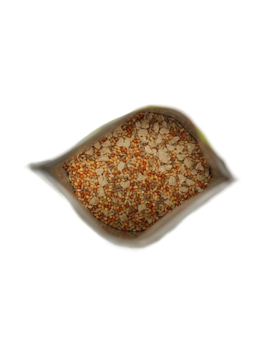 СОСТАВ: просо красное, просо желтое, семя канареечное, семена пайзы, витаминное печенье, юкка шидигера, рапс, семена чиа, комплекс пробиотиков, натуральный адсорбент – дрожжи (S.cerevisae). Питательная ценность на 100г : белки 11,38%, жиры 8,01%, углеводы 59,30%, клетчатка 5,93%, зола 3,67%, полиненасыщенные жирные кислоты (включая Омега 3-6-9) 1,98%, влага 4,50% кальций 98,74 мг, фосфор 344,37 мг, калий 387,48 мг, медь 0,98 мг, марганец 3,01 мг, цинк 2,33 мг, Витамин В1 1,16 мг, Витамин В3 0,14 мг, Витамин В12 2,50 мкг Энергетическая ценность на 100г: 339,99 ккал.