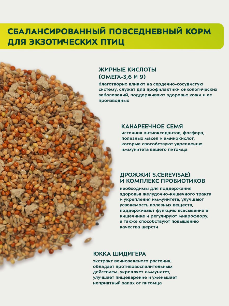 Сбалансированный повседневный корм для экзотических птиц создан с заботой о ваших амадинах, амарантах, астрильдах и других ткачиковых. Наши специалисты подобрали ингредиенты с учетом питания экзотических птиц в дикой природе. В состав рациона входит комплекс витаминов для крепкого здоровья, омега-3 и 6 для здоровой кожи и перьев, пробиотики для здорового пищеварения. Корм Bambini Pets не только вкусный, но и полезный.