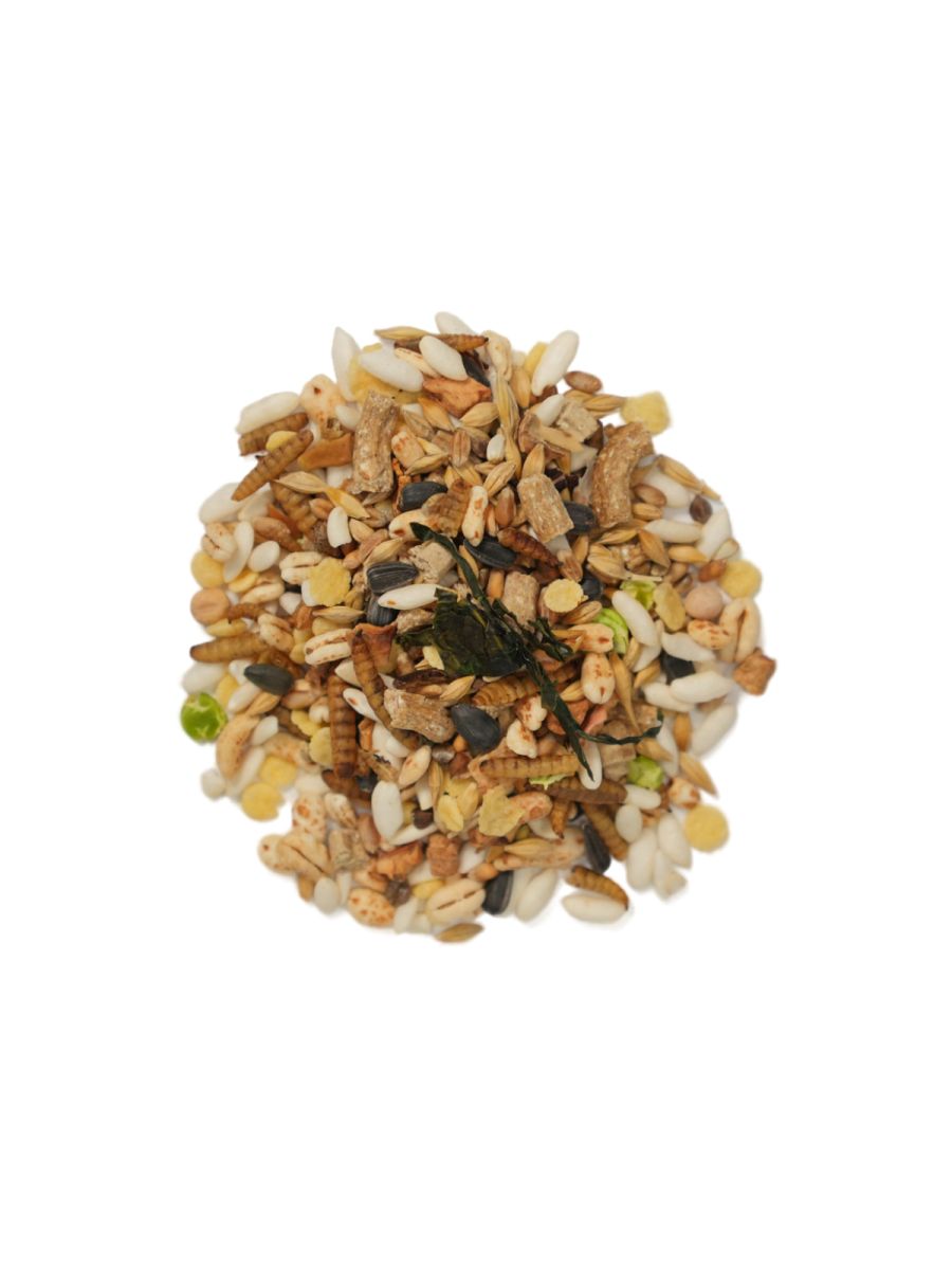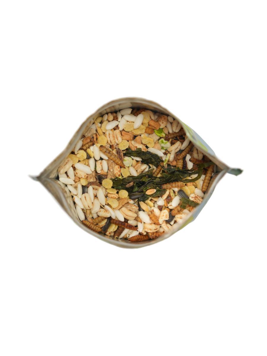СОСТАВ: пшеница, ячмень, зерновая гранула, семечки подсолнечника, гранулы для грызунов, семена гречихи, горох, плющеный горох, кукурузные хлопья, сафлор, рис воздушный, ячмень воздушный, высушенные личинки черной львинки, кусочки кэроба, семена конопли, сушеные яблоки, тыквенные семечки, ламинария, юкка шидигера, комплекс пробиотиков, натуральный адсорбент – дрожжи (S.cerevisae). Питательная ценность на 100г : белки 14,72%, жиры 5,30%, углеводы 25,04%, клетчатка 9,97%, зола 2,29%, полиненасыщенные жирные кислоты (включая Омега 3-6-9) 4,44%, влага 4,50%, кальций 85,00 мг, фосфор 332,53 мг, калий 477,87 мг, медь 0,82 мг, марганец 2,22 мг, цинк 1,96 мг, Витамин А 30,50 мкг, Витамин С 5,55 мг, Витамин В1 0,15 мг, Витамин В3 1,82 мг, Витамин В12 1,50 мкг Энергетическая ценность на 100 г: 124,19 ккал.
