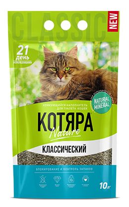 Комкующийся наполнитель КОТЯРА Классический с новой формулой NATURAL MINERAL полностью натуральный экологически чистый состав, естественный и комфортный для кошек.
