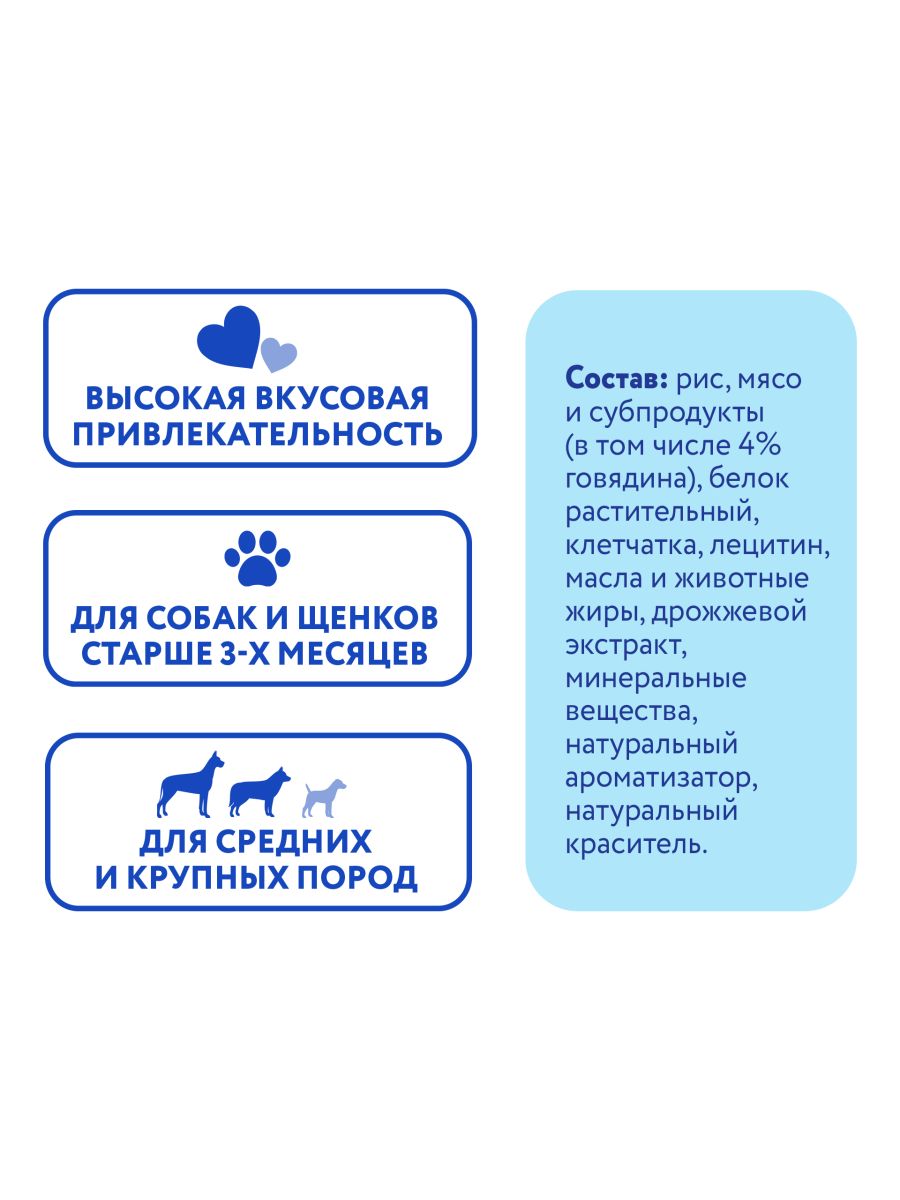 рис, мясо и субпродукты (в т.ч. говядина 4%), белок растительный, клетчатка, лецитин, масла и животные жиры, дрожжевой экстракт, минеральные вещества, натуральный ароматизатор, натуральный краситель.