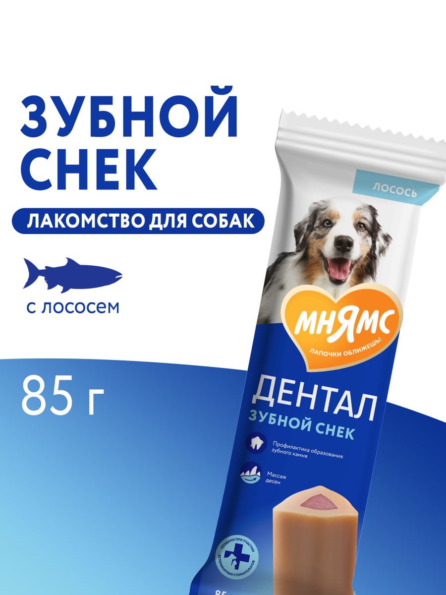 Мнямс ДЕНТАЛ "Зубной снек"с лососем – вкусное и полезное лакомство для взрослых собак крупных пород и щенков крупных пород старше 3-х месяцев. Обладает высокой вкусовой привлекательностью и прекрасной поедаемостью. Благодаря особой форме гарантирует тщательное очищение даже самых труднодоступных мест полости рта, предотвращает появление налета и обеспечивает профилактику появления зубного камня, обладает антибактериальным и освежающим действием, деликатно массирует десны.