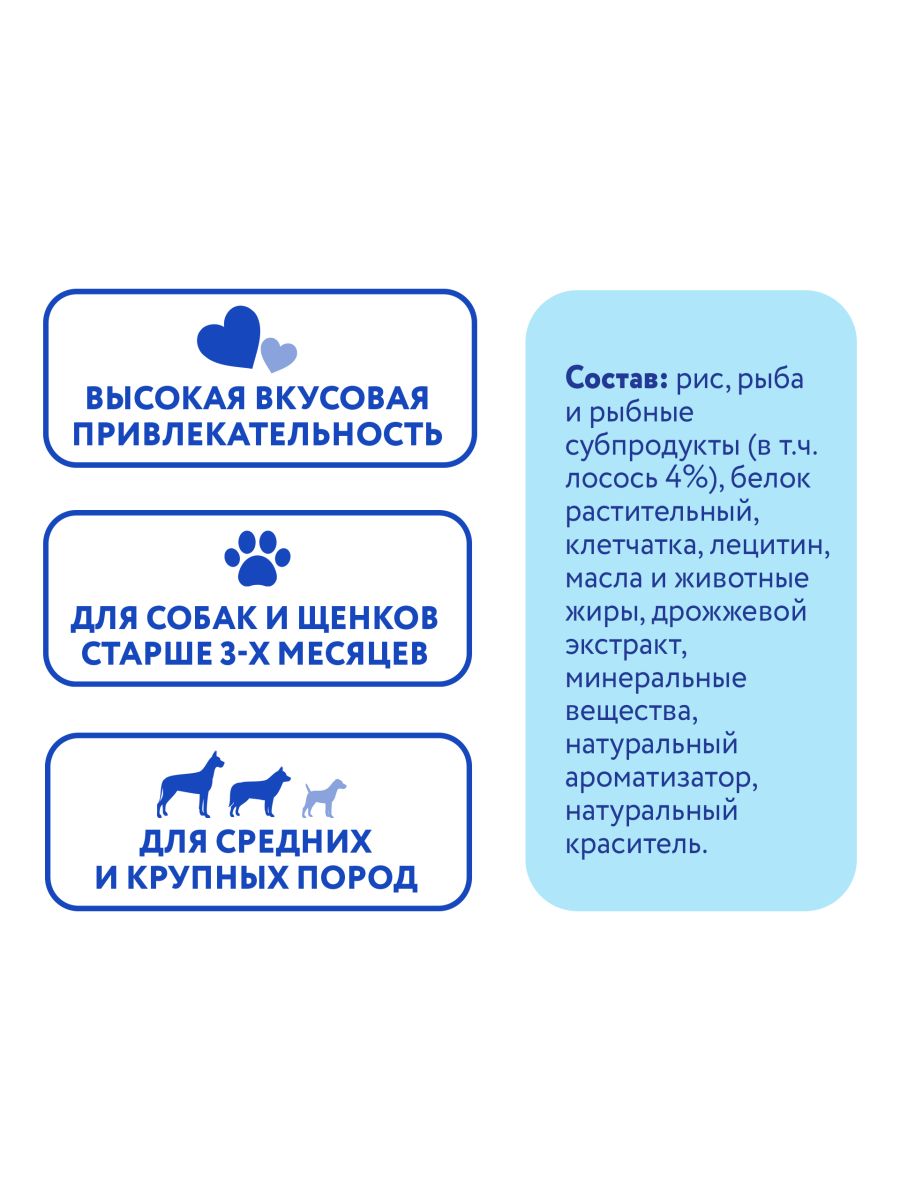 рис, рыба и рыбные субпродукты (в т.ч. лосось 4%), белок растительный, клетчатка, лецитин, масла и животные жиры, дрожжевой экстракт, минеральные вещества, натуральный ароматизатор, натуральный краситель