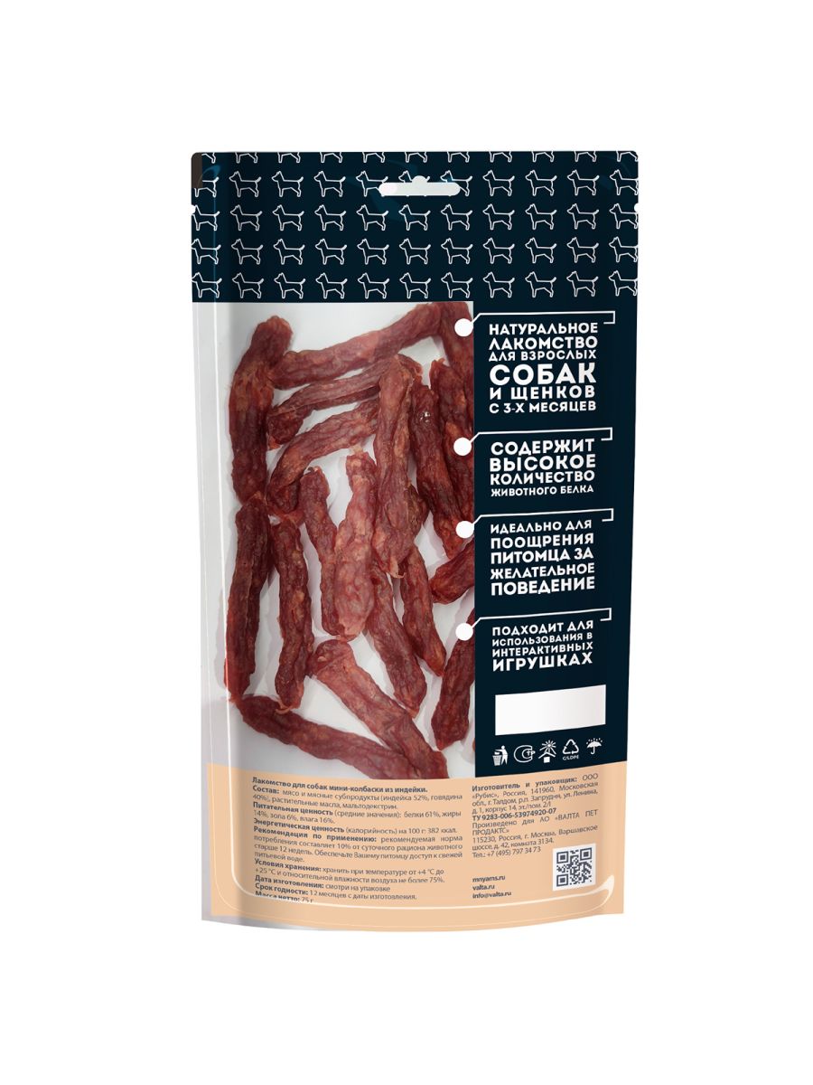 Мнямс лакомство для собак Мини-колбаски из индейки - вкусное и полезное лакомство для собак мелких и средних пород, а также щенков старше 3-х месяцев с высоким содержанием белка, незаменимыми аминокислотами, витаминами и минералами. Обладают высокой вкусовой привлекательностью, идеально подходят в качестве ежедневного угощения и поощрения во время тренировок.