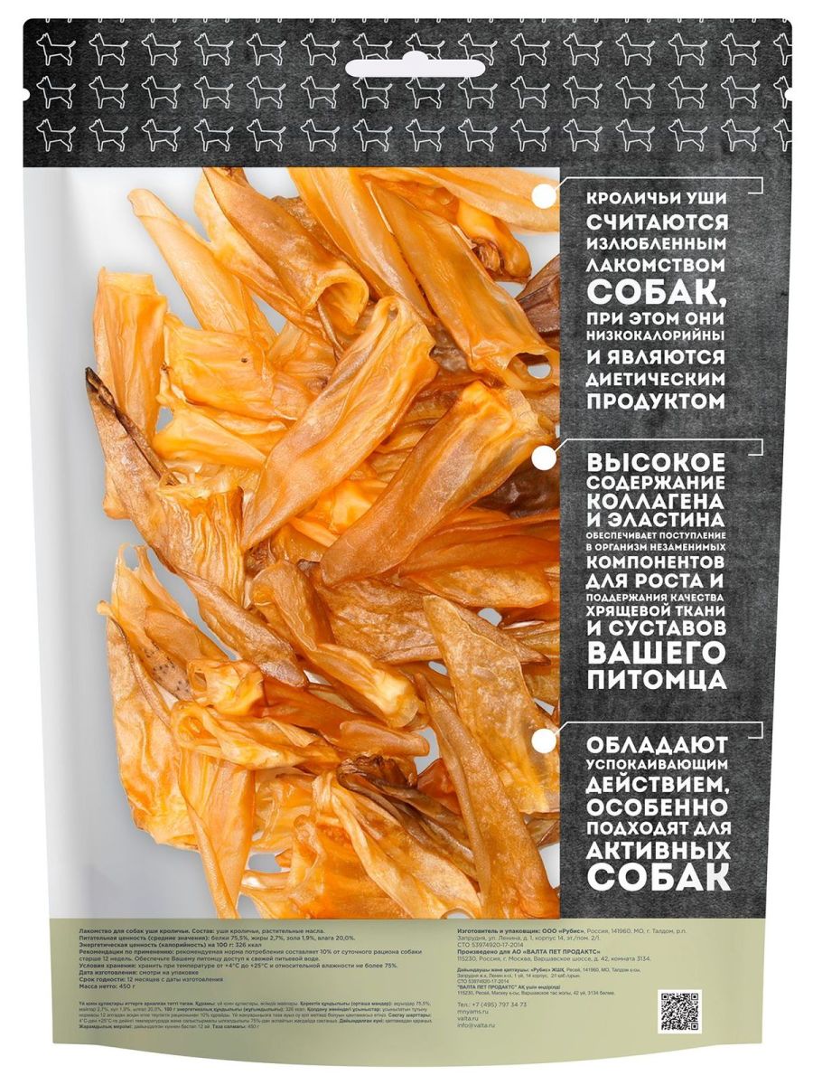 Кроличьи уши считаются излюбленным лакомством собак, при этом они низкокалорийны и являются диетическим продуктом. Высокое содержание коллагеновых и эластиновых волокон обеспечивает поступление в организм незаменимых компонентов для роста и поддержания качества хрящевой ткани суставов Вашего питомца. Обладают успокаивающим действием, особенно подходят для активных собак.