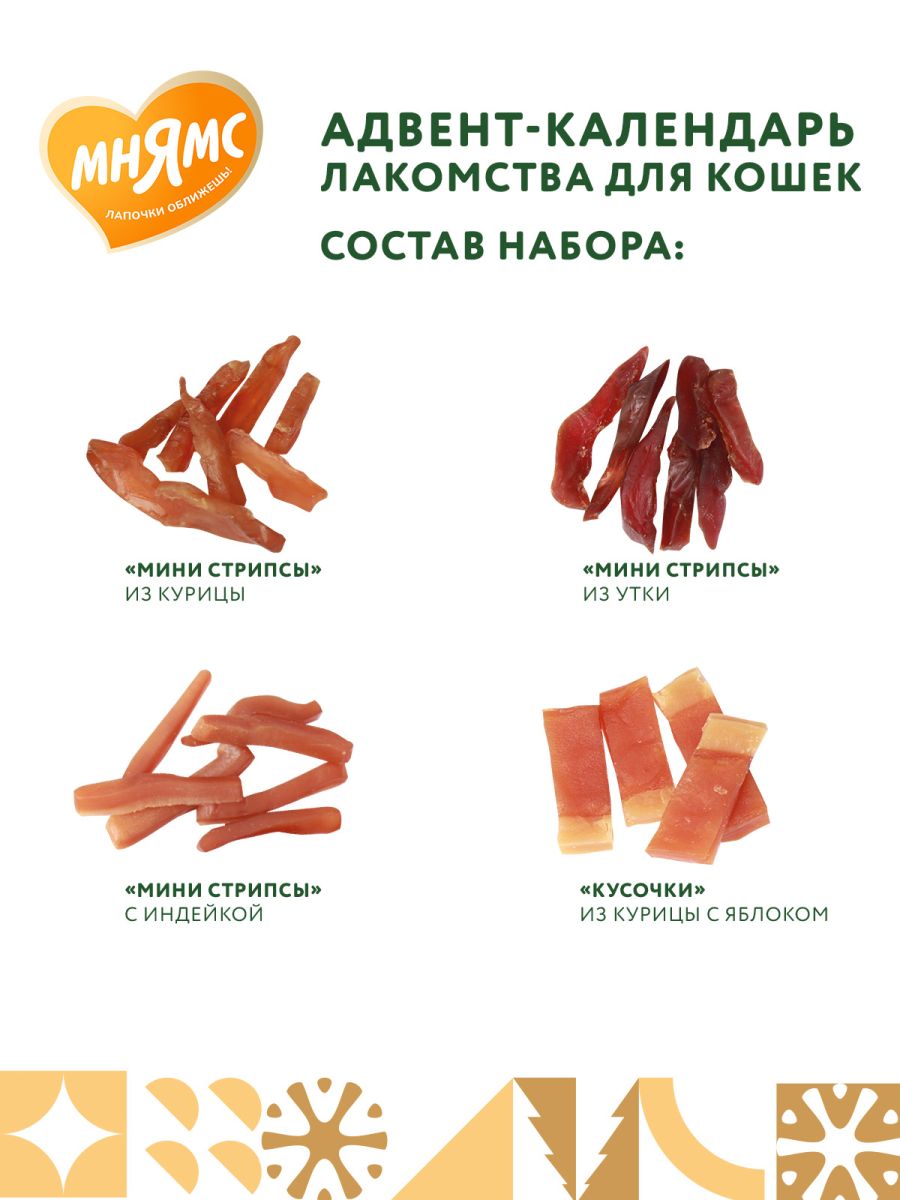 Набор лакомств для кошек Мнямс «Адвент-календарь». Хотите, чтобы ваша кошка ждала праздника вместе с вами? Подарите ей адвент-календарь "Мнямс"! В каждом окошке - натуральные и полезные лакомства, которые обязательно понравятся вашему любимцу. Открывайте окошки одно за другим и дарите вкусные эмоции каждый день!